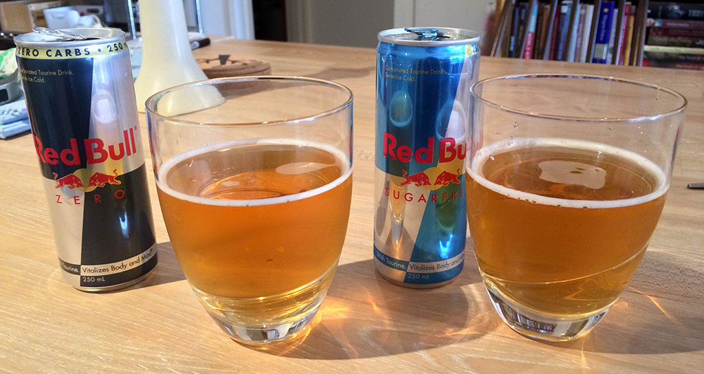Red Bull tastes just like it smells, which means that Zero had a cloying sweetness and a slightly flat sensation while Sugarfree was much more refreshing, washing away the taste of artificial “fruit” flavour with extra fizz and more unidentifiable sourness. Strangely, Red Bull Zero was also noticeably thicker than Sugarfree. I mean, it wasn’t like leek and potato soup or something like that, but, while Sugarfree is about as thick as soda water, Zero was practically jelly in comparison**.