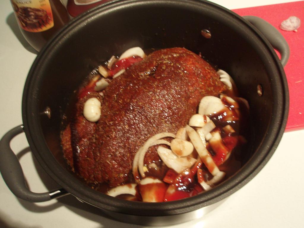 Put the lid on the pan, and place the whole thing into the oven. For four hours.