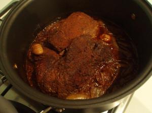 I also try to regain some of the lost smokiness of the “true” recipe at this point by putting a generous amount of my secret weapon into the cooking liquor – liquid smoke. I bought it from a crazy USA food import place located in Melbourne. If you have this, by all means, add it to the liquid. The meat will absorb some of the smokiness, and we will use the cooking liquor to make a sauce later on.
