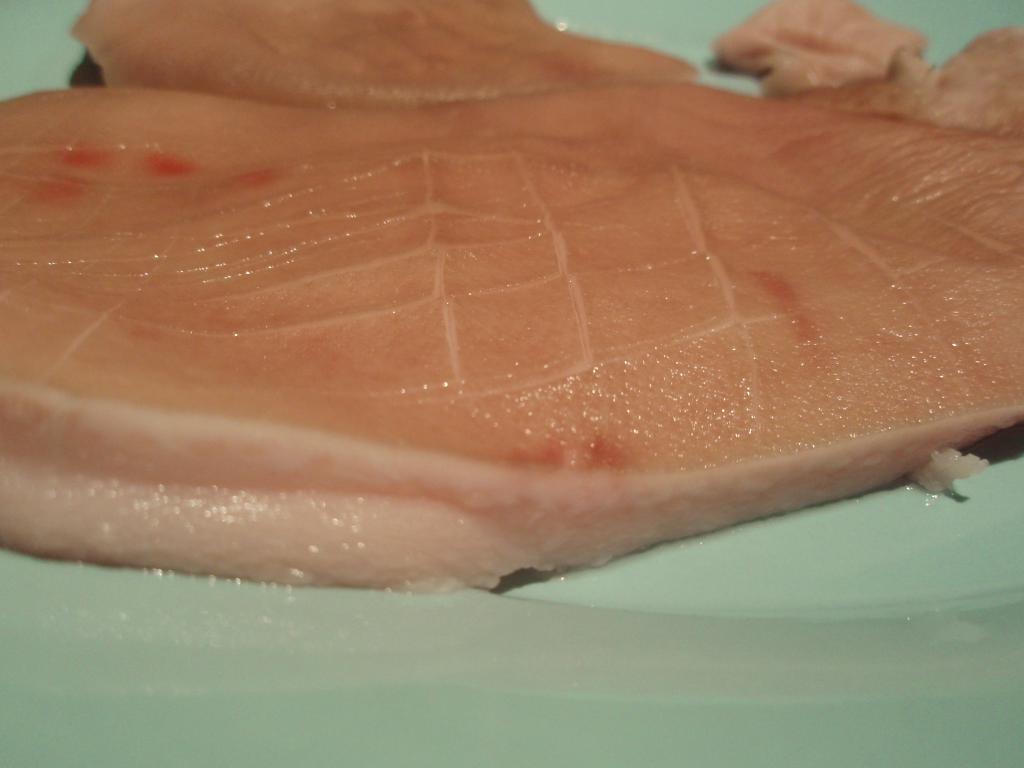 We can now deal with the crackling! Take the crackling out of the fridge, and score the skin with a very sharp knife. Boil some water, and pour it over the skin side of the crackling. The skin should contract and react to the water. When it stops contracting, it’s ready. This technique of scalding crackling is a seriously retro method, but it seems to work very, very well. Now comes another important part, pat dry the crackling with paper kitchen towels. You must ensure it is totally, totally dry. Place it back in the fridge, uncovered, to dry out even further.