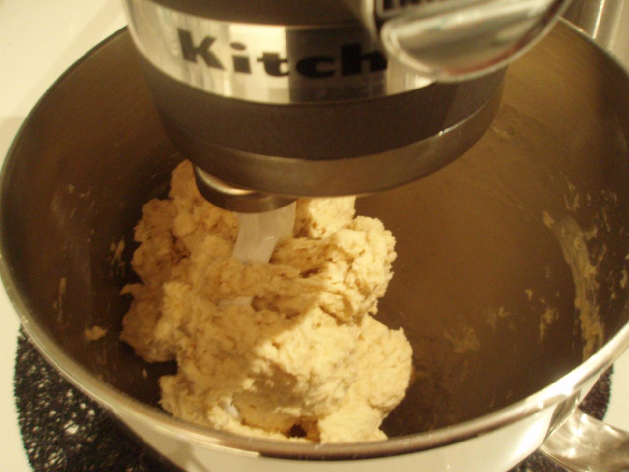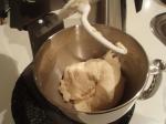 Pour everything into the mixing bowl and mix with either a paddle attachment or a spoon (if you foolishly don’t own a stand mixer). Mix it together for about a minute (at the lowest speed). It should make a very coarse, lumpy dough, as pictured to the right. Extract your paddle mixer (or spoon – this is harder than it might sound), and switch to a dough hook (or human power) – knead the dough for two minutes. It will look slightly less lumpy.