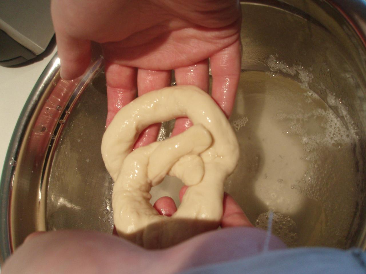 Next, you have to shape the dough by twisting the ends together and folding them over into an approximation of a pretzel shape. I apologise for the picture, that piece actually had to be untwisted and rolled out again – it produced what would become a sort of lumpy pretzel flavoured ball as I didn’t roll it out nearly long enough. See this picture of pretzels for an idea of the shape we’re looking for.