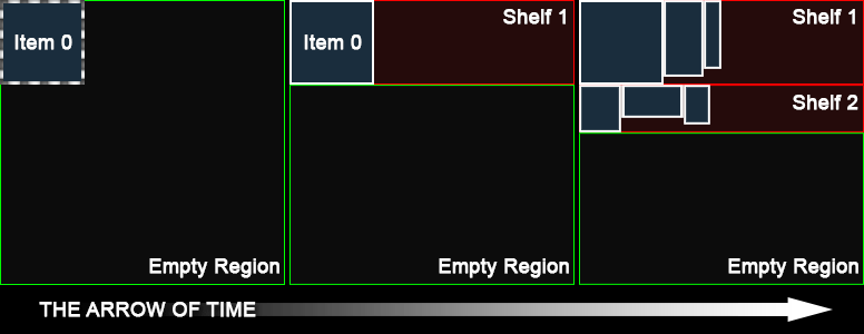 This one is simple – pick an axis (let’s choose Y, nobody likes X). Insert a rectangle into the top left of the atlas region. Split the atlas along the axis you picked – anything of equal or lesser size in that axis (depending on the heuristic) can fit next to the rectangle you just placed – anything that doesn’t fit goes into the un-allocated space below. This is called the Shelf structure because it produces “shelves” of similarly sized objects.