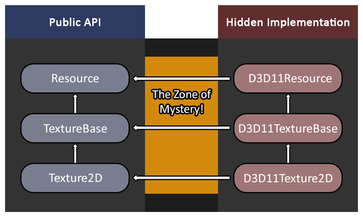 // API headers class Resource; class TextureBase : public Resource; class Texture2D : public TextureBase; // Implementation headers class D3D11Resource : public Resource; class D3D11TextureBase : public D3D11Resource, public TextureBase; class D3D11Texture2D : public D3D11Texture2D, public Texture2D;