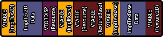 Also you need all those virtuals, no skimping (or you’ll get compile errors for ambiguous function lookups)! This “works” and “folds in” the classes in the same way that one could “fold in” a toddler into a tyrannosaurus. Let’s just imagine a setup where D3D11TextureBase has a single int (I am regretting not using OpenGL as my example API), and D3D11Texture2D has two. The memory layout of an instanced D3D11Texture looks like this: