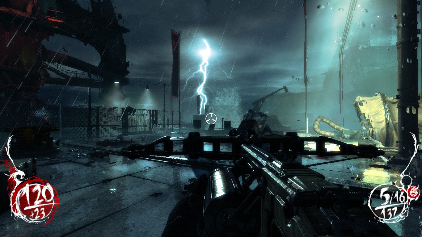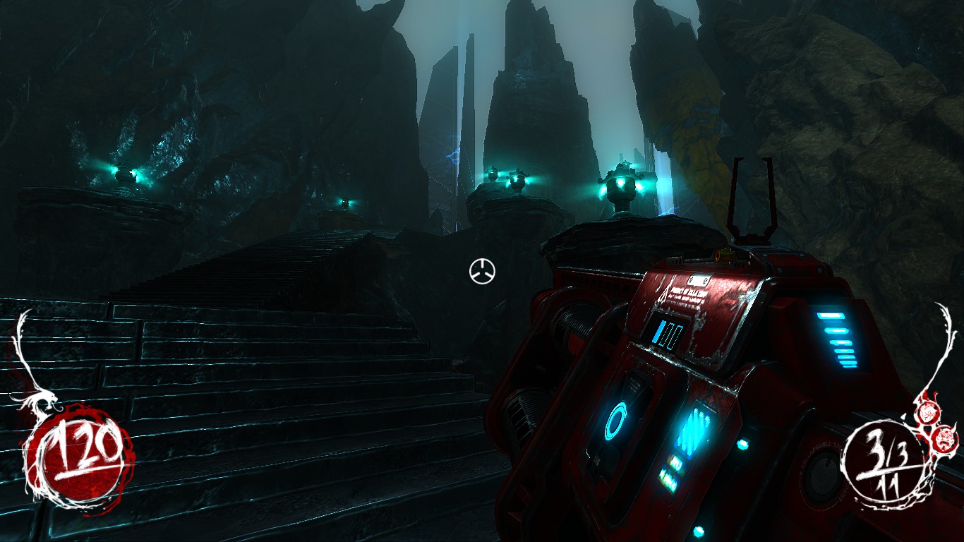 Talking about level design, it’s pretty good. The areas are varied and split into encounter arenas, and they have some… adventurous use of colour going on (magenta, in my shipyard?), but it works well overall. It’s a little samey towards the end (especially in the “traditional” themed parts), but that’s to be expected – I also suspect the prop artists have been playing Oblivion, as they went for the “covered in jam” look to represent the unlucky humans caught in the demonic invasion. It seems that the designers and artists have been given pretty much a free reign; from temples and a mountain fortress, to toxic waste pools (they were really channelling 90s level design with that one) as well as a shipyard during a storm (all filled with conveniently placed barrels of TNT and LPG). I should also mention at this point the eerie shadow realm, where the demons are from – you visit it multiple times throughout the story – which looks incredible; majestic, sad and eerie at the same time.