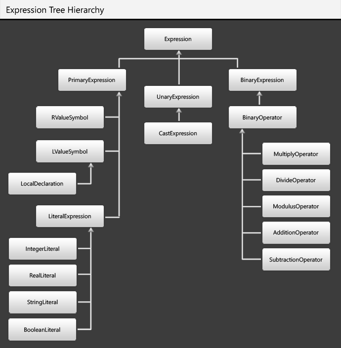 The compiler has been given an ASTNode representing the element called “statement_block” in the above grammar. It contains zero or more children of the type “statement”, each of those contain either an “exp_assignment” or an “exp_local_declaration” as their child node, etc. Now, Hime is essentially a black box. It’s licensed under the LGPL – so we won’t be messing with their expression tree. I also am not using callbacks to respond to the parse tree as it’s generated (much like you might do when parsing a data file like JSON or the comedy YAML option), so we’re looking at a complete AST.