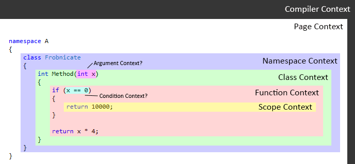 As an example in the mockup above, we can see several (nesting) contexts – and the expressions within those contexts can use them to derive semantic information. At the moment, we are only really concerned with two uses for contexts: