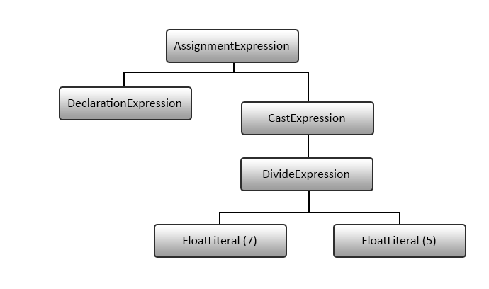 LDC_F4 5.0f // generated by literal expression LDC_F4 7.0f OP_DIV (F4) // divide expression CONV_F4_I4 // cast expression ST_LOC 'value' // declaration expression (lvalue) // note that the assignment expression did not generate code